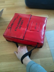 Aircraft regulations require all passengers to wear life jackets at all times while flying over the sea. Maritime stores offer comfortable life jackets at reasonable cost, using a small CO2 bottle and – most importantly – manual activation so that one doesn't block the exit should the jacket get wet before having left the aircraft. Right before the impact, it is important to open the cabin doors to make sure they don't get blocked by the water pressure (there is also the option to smash the rear window with the feet and we always carry an axe on board). The sea is colder than the human organism and therefore there is limited time until one freezes to death. In the Med in winter, this is about one hour. Getting out of the water is therefore important and this is what inflatable life rafts are designed for. For this trip, a life raft was purchased, hoping that we will never have to find out whether it actually works.