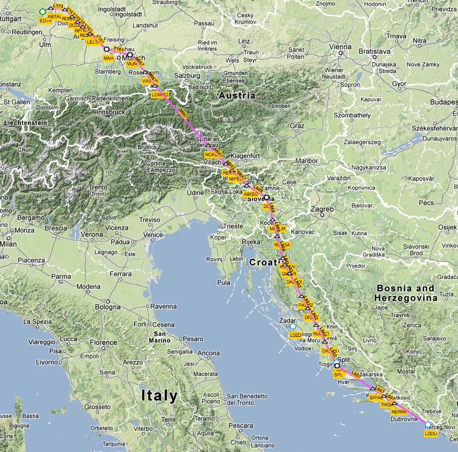 Now a few details on our legs, each with the planned IFR routing and its distance. The flight duration chiefly depends on the wind, which can only be reliably forecast shortly before departure. The distances given are larger than the direct distances as the IFR routes are not always ideal. In reality one usually receives shortcuts (directs) when airborne. However, the more south one gets, the rarer the shortcuts become and when doing the planning, one should never expect to get any shortcuts at all.